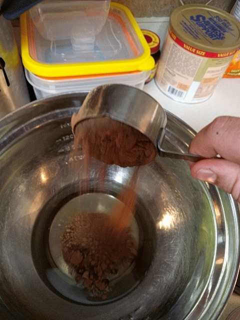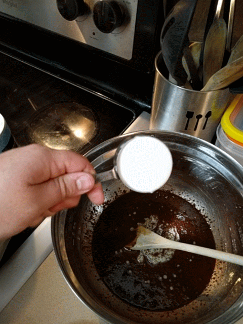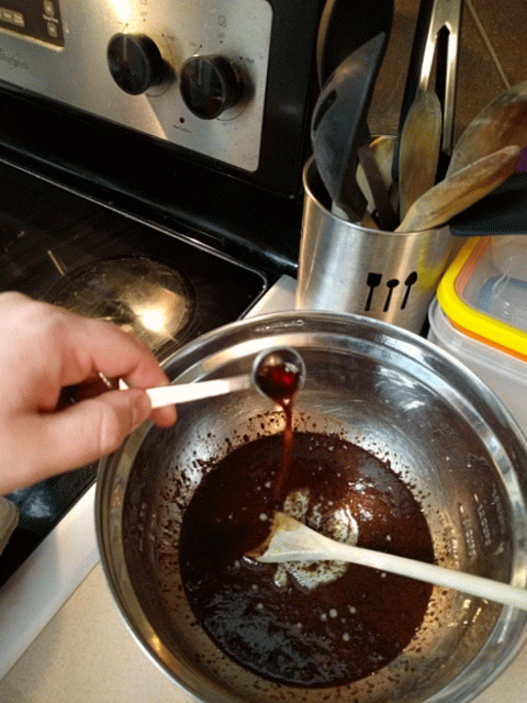 In your large mixing bowl, dump the vegetable oil and gently stir in the cocoa powder until a uniform mixture is formed. You’re shooting for as few bubbles as possible here, otherwise you’ll end up with something that resembles cake rather than brownies with the power to take away free will.