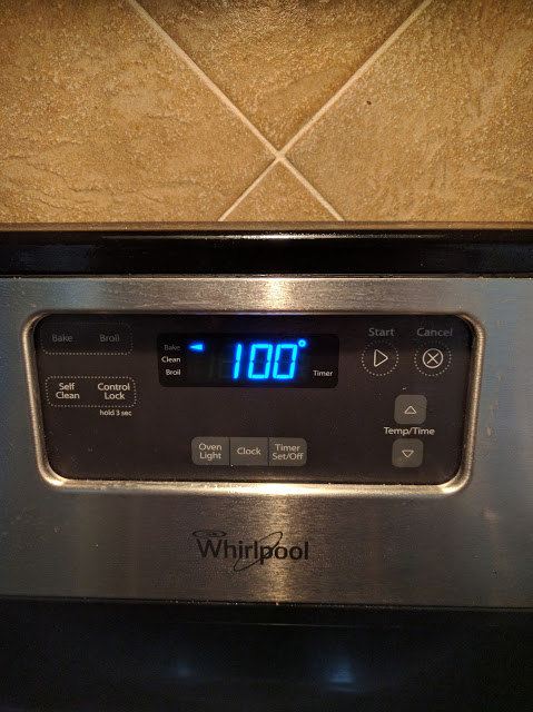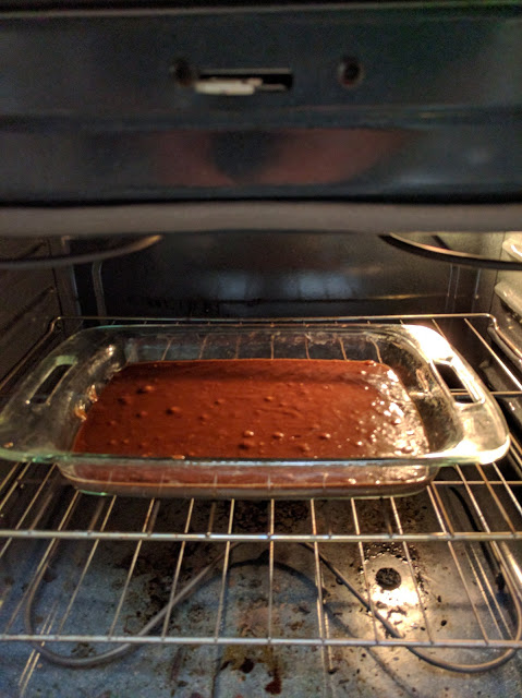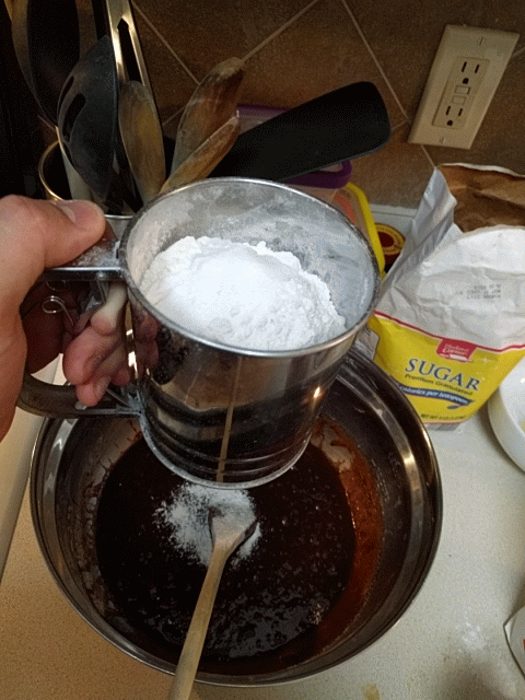 Finally, sift the flour, salt, and baking soda together into the bowl and stir gently until combined (avoid bubbles). Pour into your greased glass pan and pop it in the waiting oven.