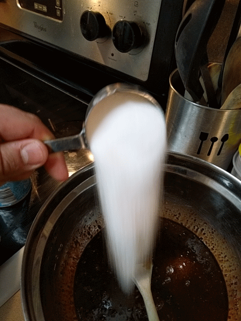 Once this is done add in the previously beaten eggs (these you should go to town on before you add them– beat them like you work as a guard at Guantanamo) and vanilla, but don’t stir yet. For the sugar– add in 1/3 of a cup and stir just until combined, repeating until you’ve added it all.