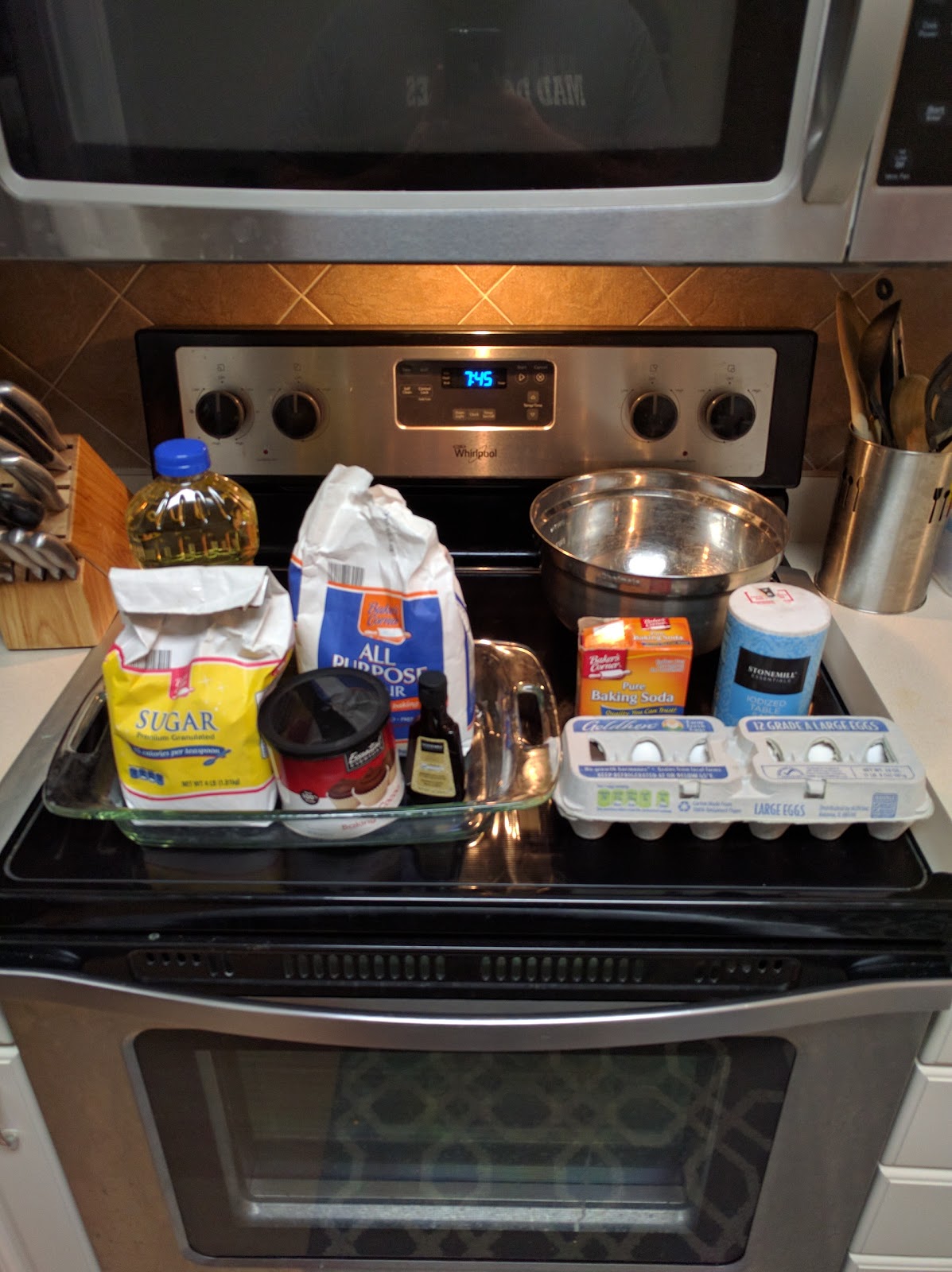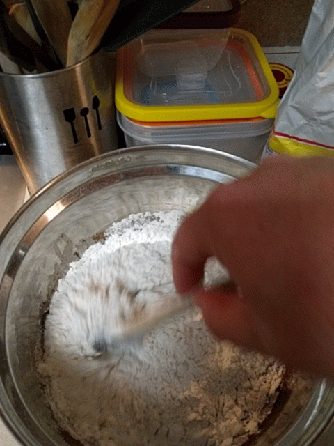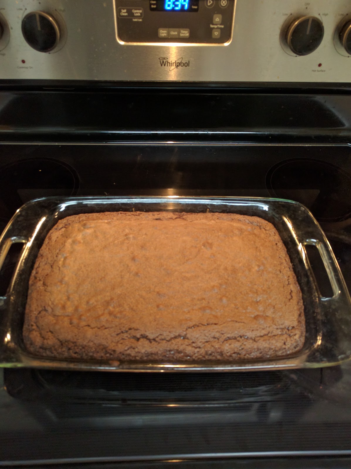 Finally, sift the flour, salt, and baking soda together into the bowl and stir gently until combined (avoid bubbles). Pour into your greased glass pan and pop it in the waiting oven.