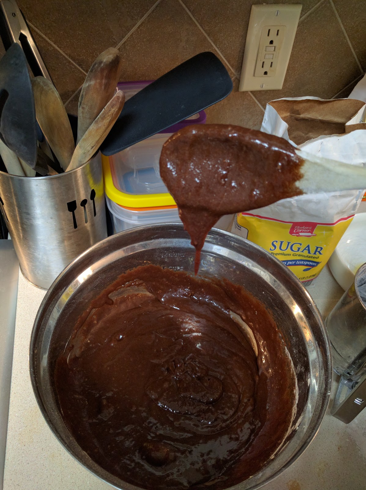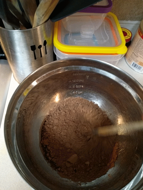 In your large mixing bowl, dump the vegetable oil and gently stir in the cocoa powder until a uniform mixture is formed. You’re shooting for as few bubbles as possible here, otherwise you’ll end up with something that resembles cake rather than brownies with the power to take away free will.