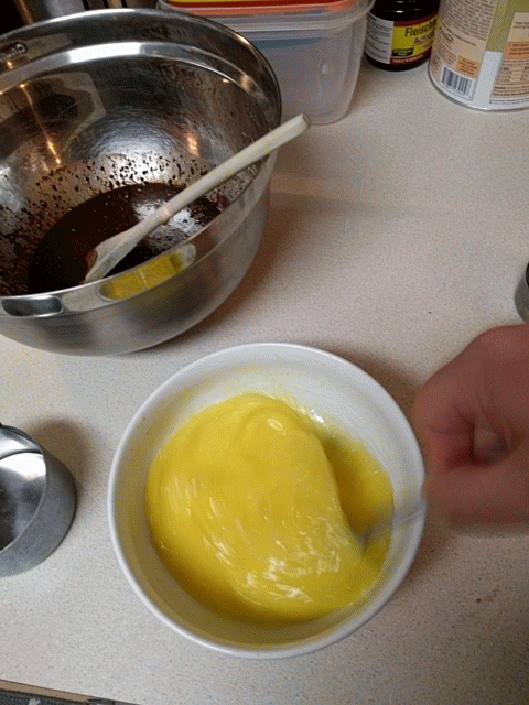 Once this is done add in the previously beaten eggs (these you should go to town on before you add them– beat them like you work as a guard at Guantanamo) and vanilla, but don’t stir yet. For the sugar– add in 1/3 of a cup and stir just until combined, repeating until you’ve added it all.