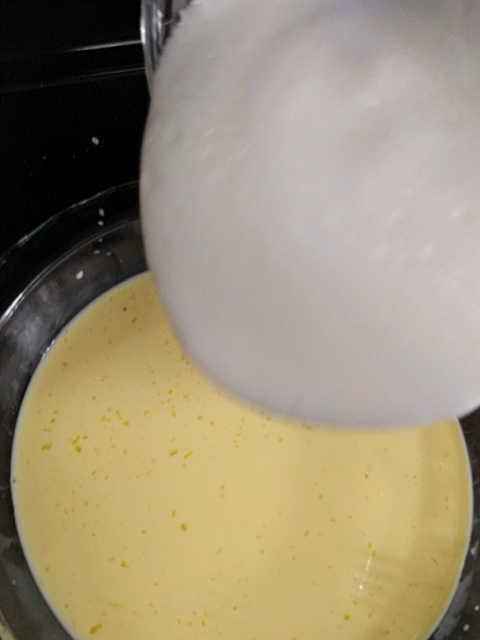 This part is important: GENTLY fold the almost-stiff-peak’d egg whites into the batter. Keep as much volume as you can, but mix it until the color is fairly uniform.