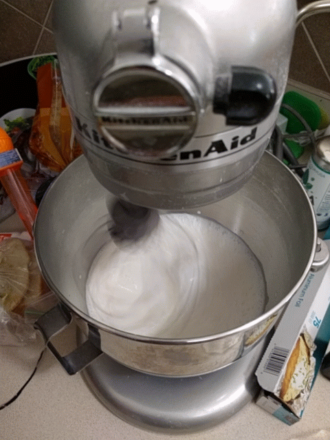 Take the egg whites, and beat them with a whisk or mixer. Watch them, we’re not looking for stiff peaks– we’re looking for a highly bubbly state with a big increase in volume that comes just before stiff peaks. If you go all the way to stiff peaks, you’ve crossed the line and your Grand Armee is doomed. It won’t taste right and the batter will be a pain to get mixed properly. Try again.