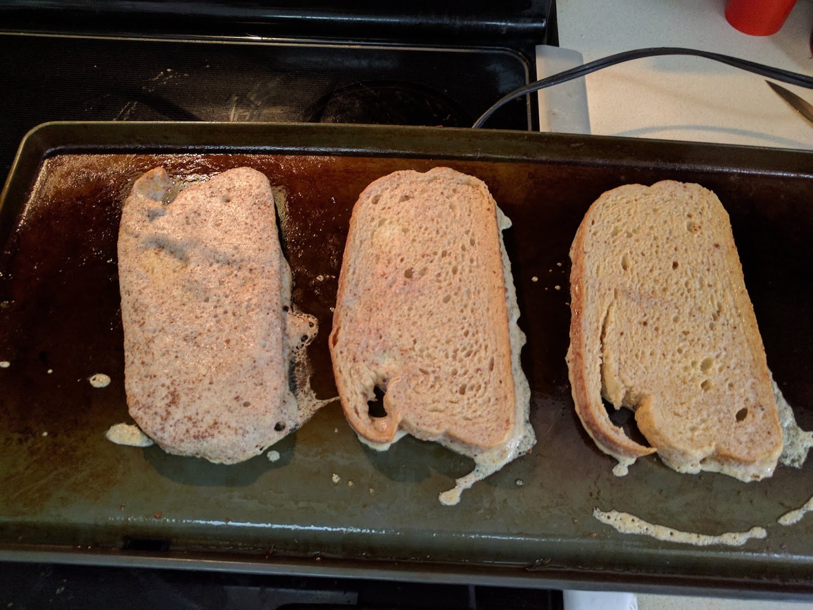 Meaning– Dip the bread on the first side for a quick second. Flip the bread. Dunk the other side for a not-so-quick second. Drop immediately onto the griddle. The side that got dunked goes on the heat first. You want them covered and pretty well soaked.
