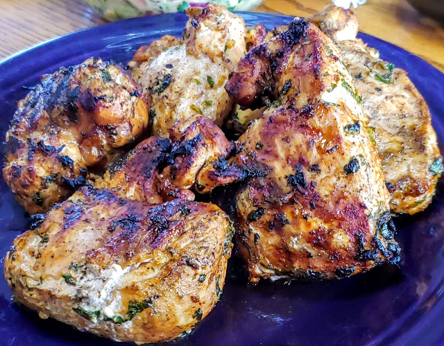 Grill chicken over medium-high heat (minimum 500 on the grill thermometer). Turn once every 5 minutes until the meat thermometer says 155 F, then remove, loosely cover with foil, and rest the meat for 10 minutes so it can finish at 165 F (don’t worry, it will).