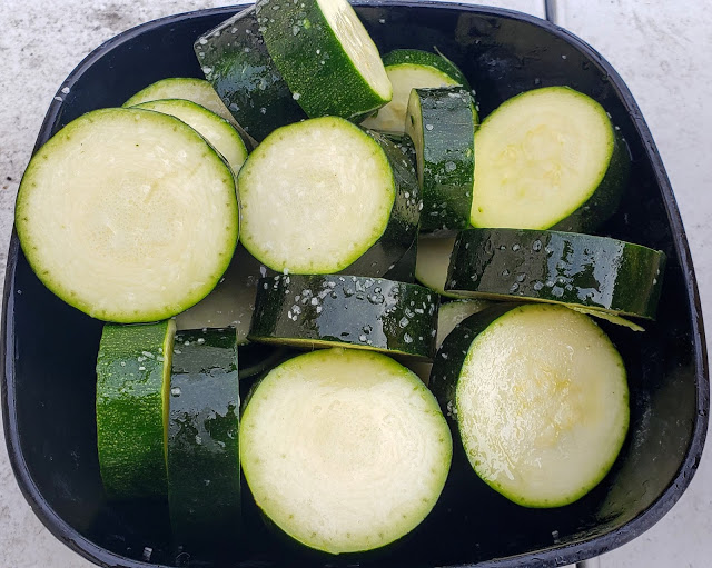Drizzle the oil over the chopped zucchini, then salt. Aim for a light coating of oil and salt over every surface of the veg.