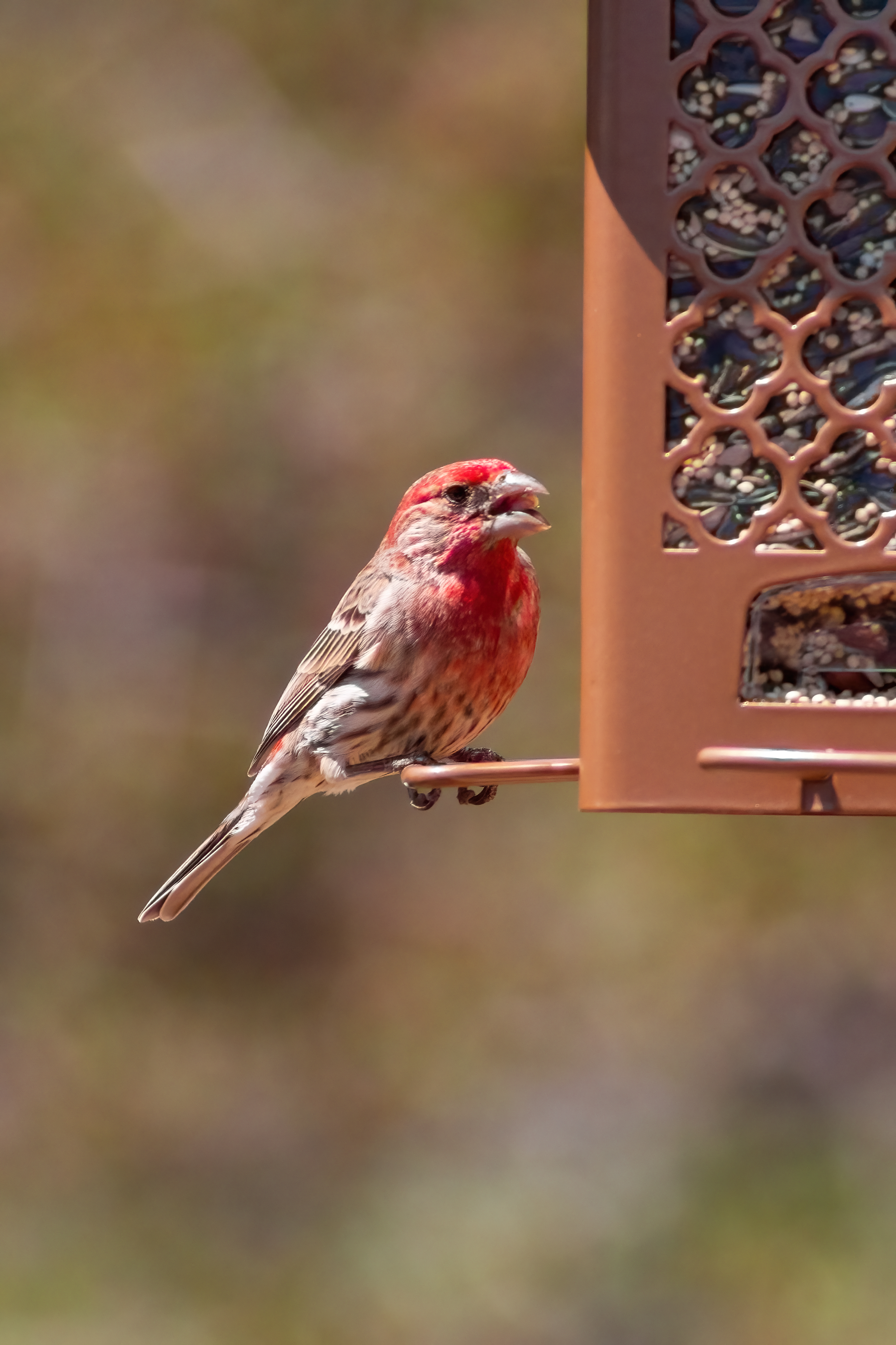 Today’s bird from my backyard is the house finch. Watch for the red on head and chest, with streaks of brown and black on wings and tail. Classic finch beak for seed eating, which this one did: